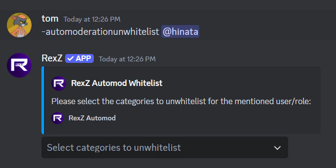 The AutoMod Un-whitelist feature in RexZ allows administrators to revoke the exemption status of certain roles, users, or bots from automated moderation rules. Once unwhitelisted, these entities will no longer bypass moderation filters, such as spam detection, word filtering, link blocking, and other moderation rules.Aliases
