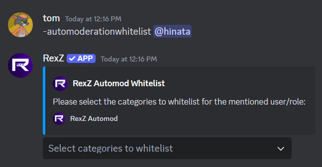 The AutoMod Whitelist in RexZ allows administrators to exempt specific roles or users from being affected by automated moderation rules. This feature is useful when you want to ensure that trusted individuals or bots can bypass moderation filters such as spam detection, word filtering, or link blocking.Aliases